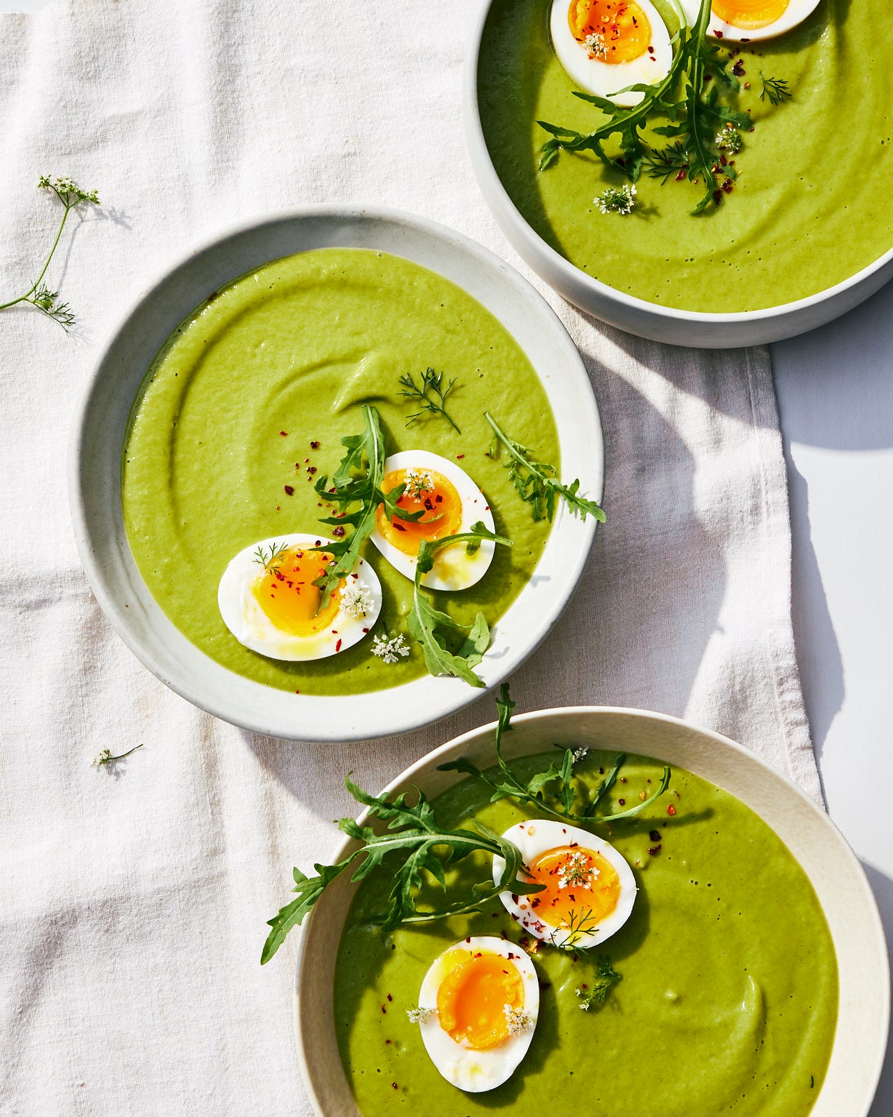 Your daily greens disguised as potato soup! This warm and creamy arugula vichyssoise was broadly adapted from Giada De Laurentiis’s fantastic recipe. I’ve omitted the two forms of dairy (Parmesan and mascarpone) contained in the original recipe, and I’ve replaced the Yukon Gold potatoes with Hannah sweet potatoes, which are white-fleshed and less sweet than other sweet potatoes. I limit the sweet potatoes to one pound, allowing the other ingredients to take center stage and balance their subtle sweetness. To make it a complete meal, I top each bowl with a halved jammy egg.